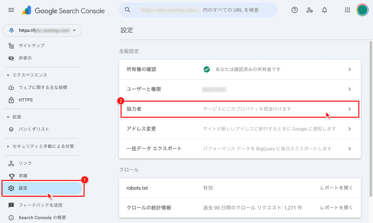 サーチコンソールの左側メニュー下部にある「設定」をクリックします。右画面の全体設定にある「協力者」をクリックします。
