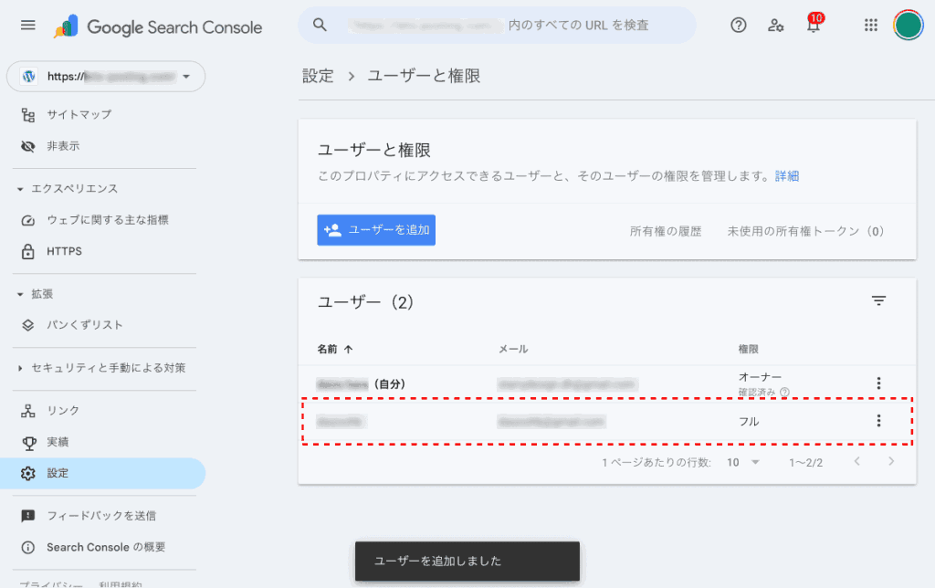 ユーザーがリストに追加され、画面下部に「ユーザーを追加しました」と通知が表示されます。これで権限付与の設定は完了です。