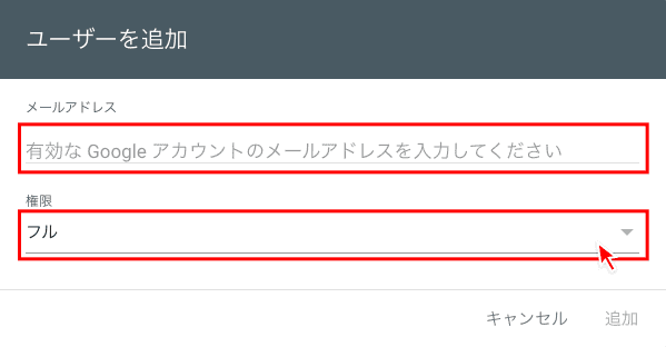 表示されるポップアップで追加したいユーザーのメールアドレス(Googlaアカウント / example@gmail.com)を入力し、権限を選択します