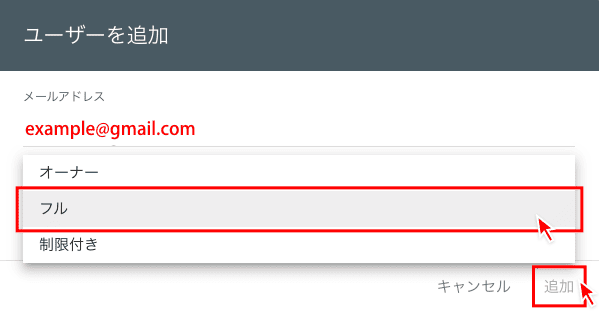 オーナー、フル、制限付きが表示されるので、「フル」を選択し、「追加」ボタンをクリックしてください。